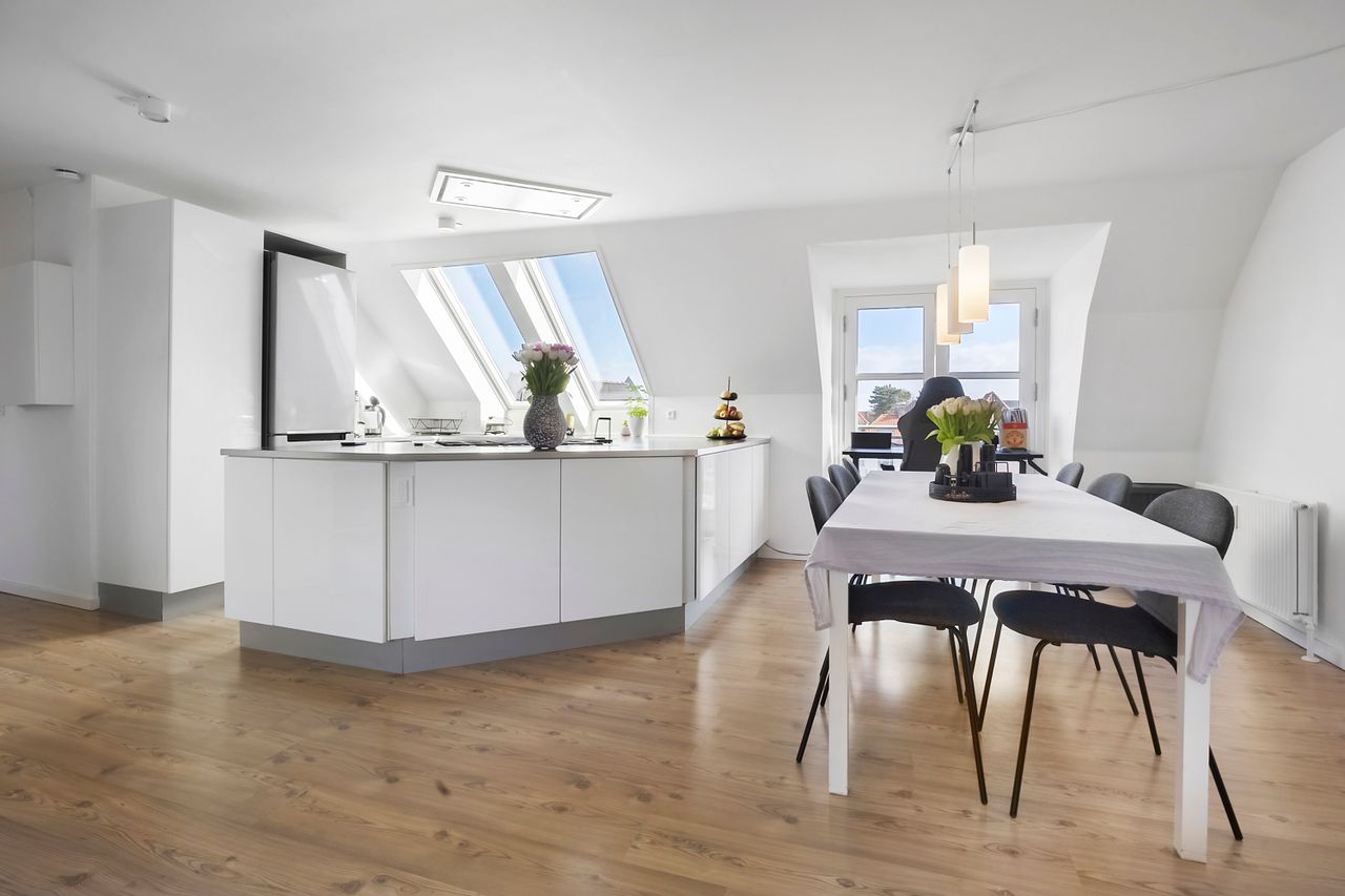 Allerede ved ankomsten mødes man af en indbydende entré med dørtelefon. Lejlighedens hjerte er det fantastiske køkkenalrum og stue der er bygget ud i et. Her kan nævnes kvisten og den franske altan der giver er godt lysindfald, Det lyse køkken med masser af opbevaringsplads samt alt i hårde hvidevarer.