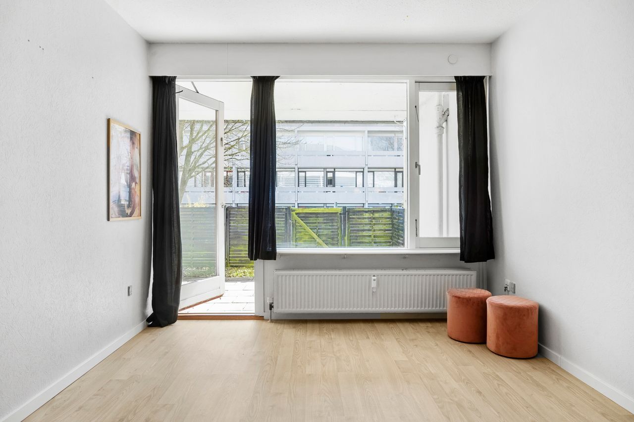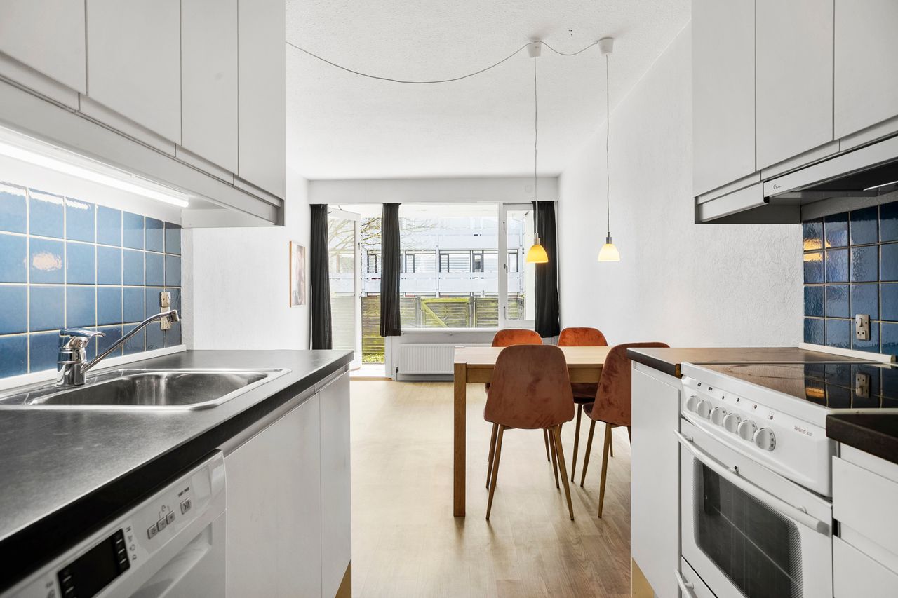 Her får du 48 veldisponerede kvadratmeter, hvor hver eneste meter er udnyttet optimalt. Lejligheden fremstår flot og moderne med gode løsninger og en indretning, der gør den både funktionel og hyggelig. Samtidig ligger lejligheden i stuen, så du har ingen trapper og får næsten følelsen af, at bo i et lille rækkehus.