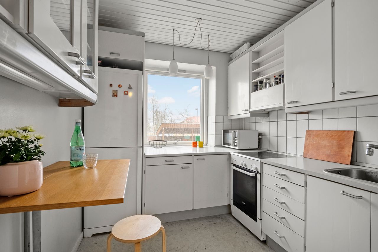 Køkkenet ligger i forlængelse af entréen og har en praktisk placering i boligen. Herfra er der udsigt til det hyggelige gårdmiljø, som giver et grønt og roligt kig i hverdagen.