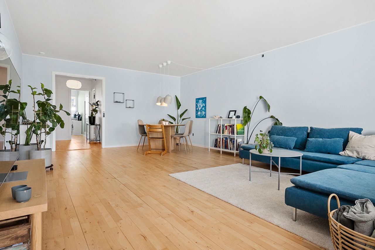 Lejlighedens hjerterum finder I, i den store, indretningsvenlige stue. Stuen vender mod syd og der er fra stuen direkte udgang til en delvis overdækket terrasse.