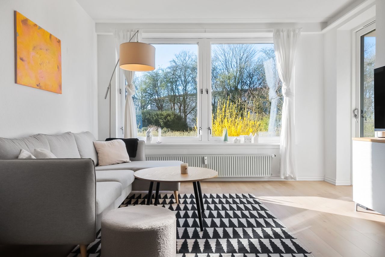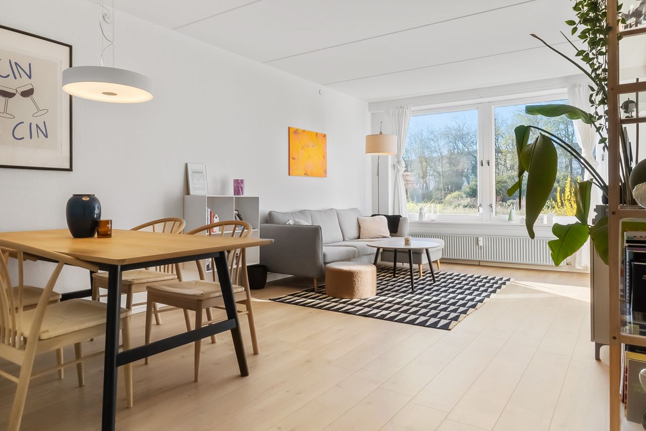 Lejlighedens hjerte er den indretningsvenlige, kvadratiske og indbydende stue, der med et fantastisk lysindfald fra det store vindues parti er klar til at danne rammerne om mange hyggestunder. Fra stuen er der udgang til en solrig overdækket altan, der er beliggende ugeneret i bebyggelsen med udsigt direkte til grønt område.
