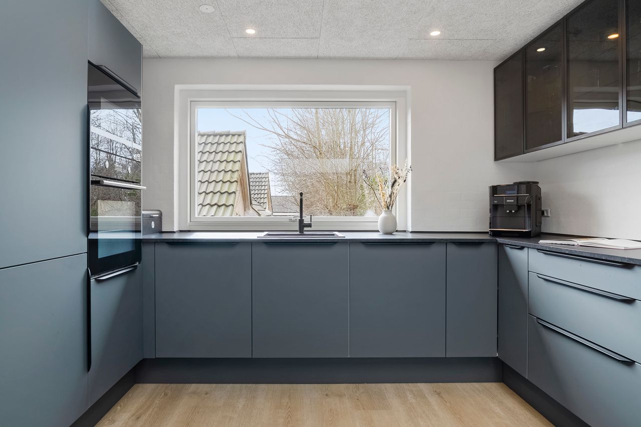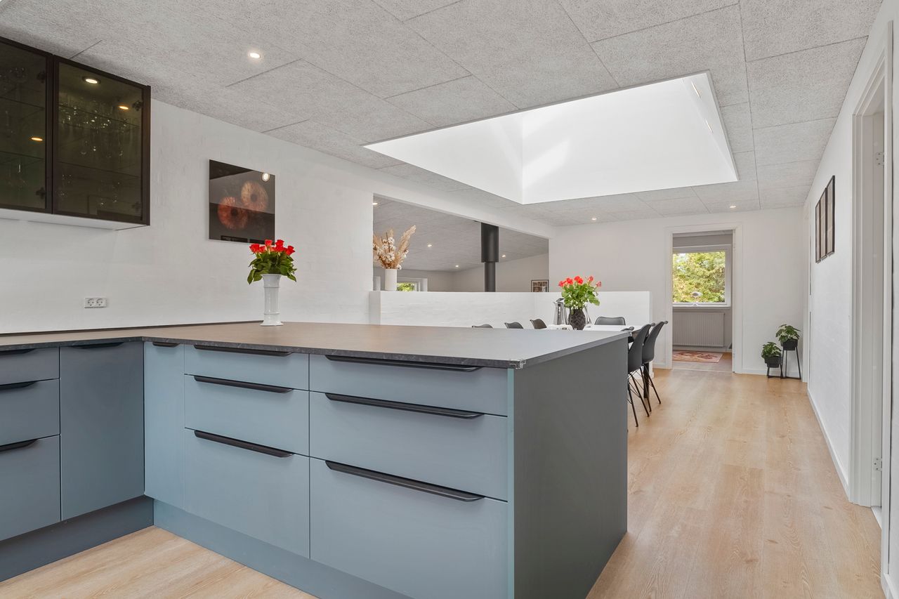 Indenfor bydes I velkommen af et lyst og åbent køkken/alrum, der bliver boligens naturlige samlingspunkt. Herfra er der adgang til en elegant, niveauforskudt stue med forskudt loft, store facadevinduer og smukke ovenlyspartier, som fylder rummene med naturligt lys og skaber en varm og behagelig atmosfære. Boligen har gulvvarme i størstedelen af huset og hele to moderne badeværelser.