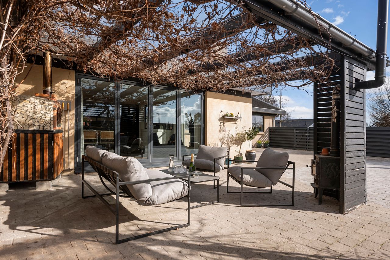 I den bagerste del af stuen er der installeret en imponerende foldedør, som strækker sig over størstedelen af væggen. Denne løsning sikrer et fantastisk lysindfald og giver samtidig mulighed for at åbne helt op mod terrassen, så ude- og indearealer smelter sammen i sommermånederne.