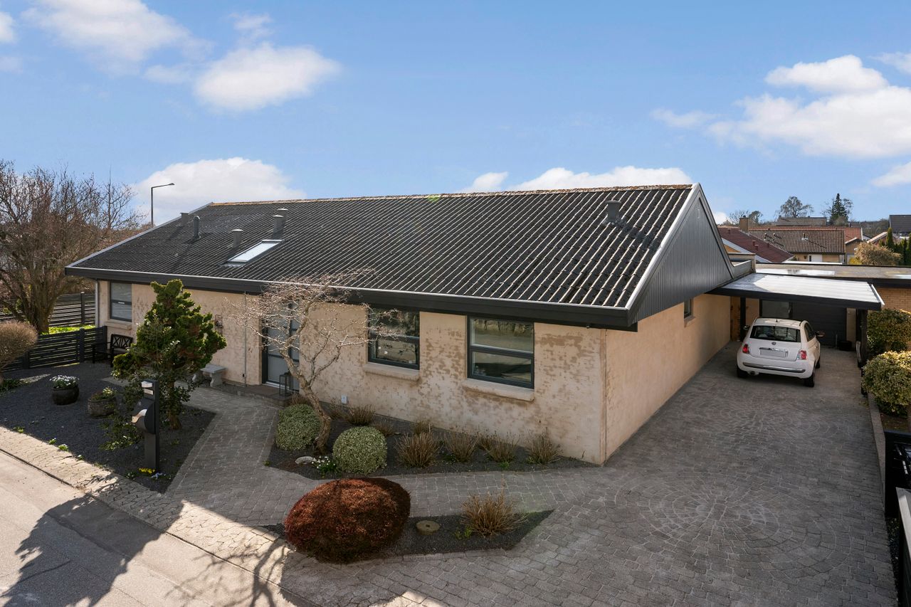 Udendørs venter en skøn fliseterrasse med et hyggeligt overdækket område, der leder tankerne mod sydlandske omgivelser. Haven er velanlagt med græsplæne, flotte træer, buske og blomster. Perfekt til både afslapning og udeliv.