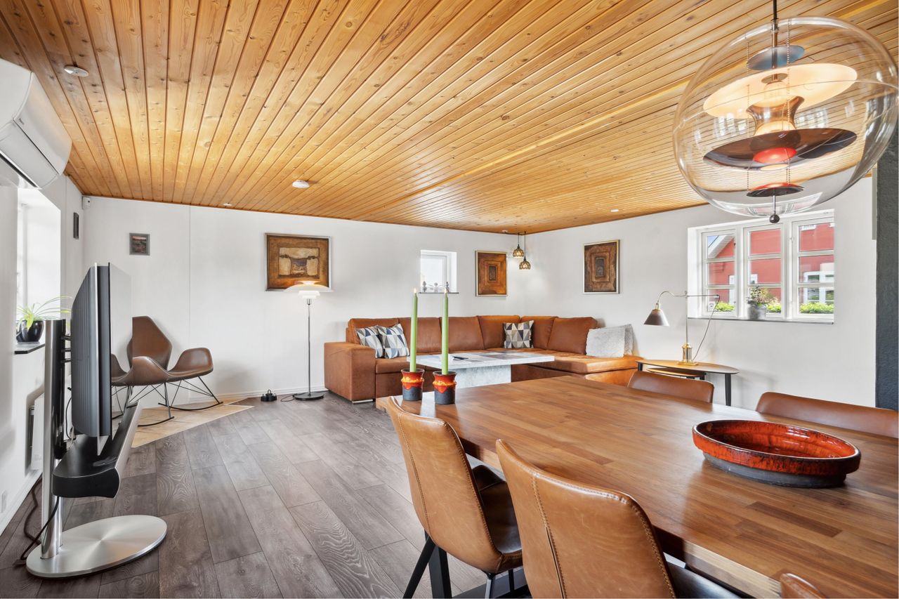 Stuen er ideel til både spiseafsnit og sofahygge, og de synlige bjælker samt sprossevinduerne skaber en