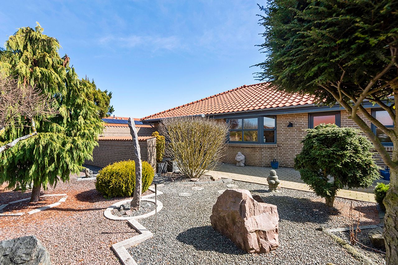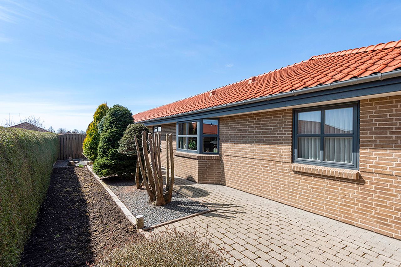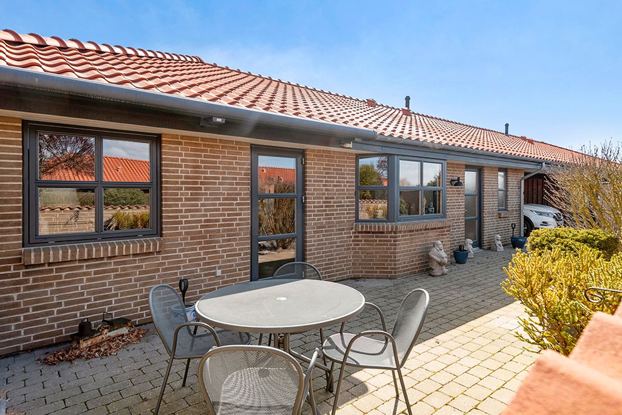 Huset har status som rækkehus, men det er fritliggende med mulighed for at gå hele vejen rundt om huset via slusen i den integrerede carport med udhus. Murede læmure på gavlene både mod syd og mod nord. Flisebelagte terrasseareler på begge sider af huset giver alle muligheder for at nyde solen.