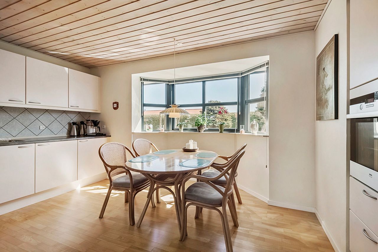 Opholdsstuen er stor og lys med karnap og i direkte sammenhæng med det store veludstyrede spisekøkken også med karnap og muret væg mod stuen. Her er plads til både spisestue og opholdsstue og så er der ikke mindst adgang til den store terrasse.