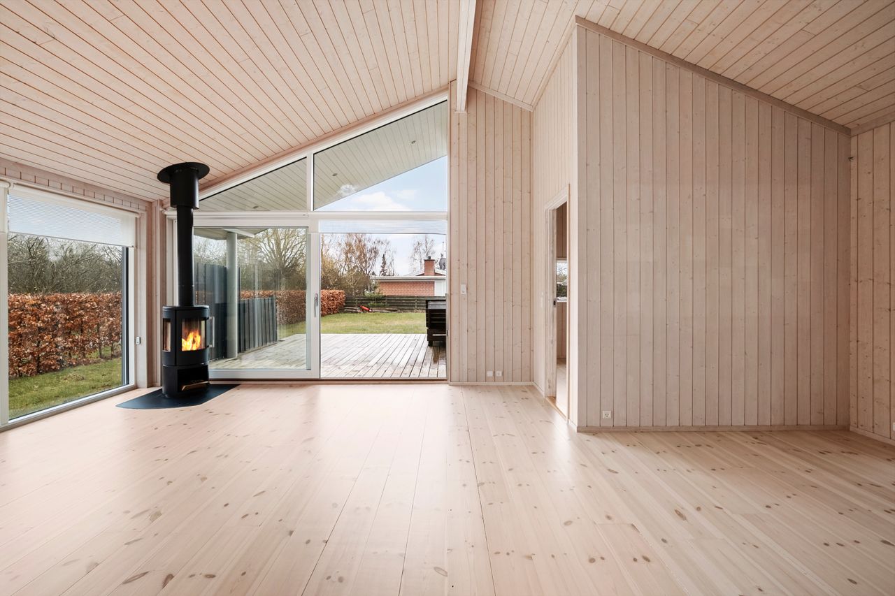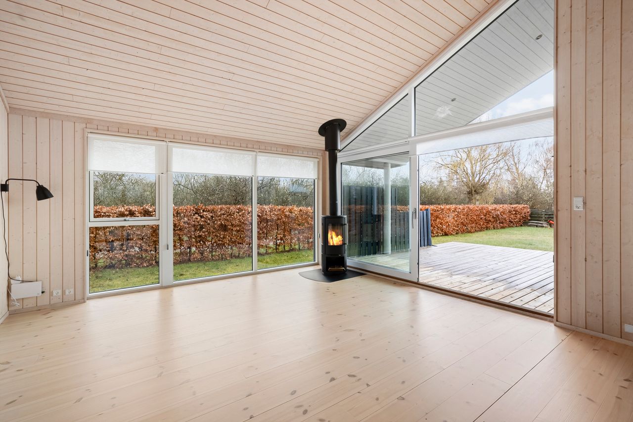 Opvarmningen sker via varmepumpe kombineret med brændeovn, som bidrager til både energieffektiv drift og ægte sommerhushygge.