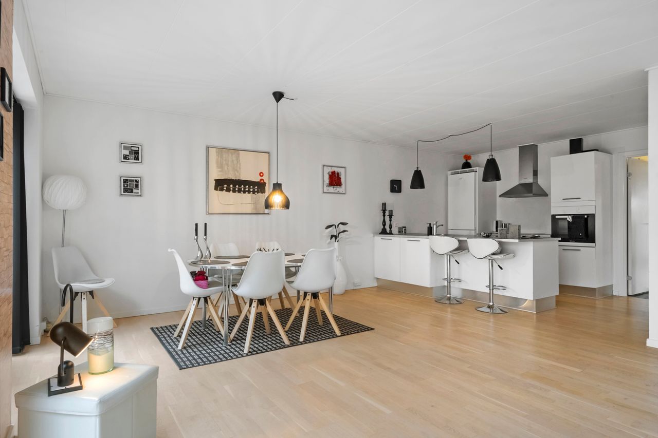 Boligen byder på en lys og indbydende indretning med et skønt køkken/alrum i åben forbindelse med stuen. De store vinduespartier sikrer et dejligt lysindfald og skaber en god sammenhæng mellem inde- og udeliv. Køkkenet fremstår moderne og funktionelt med gode arbejdsflader.