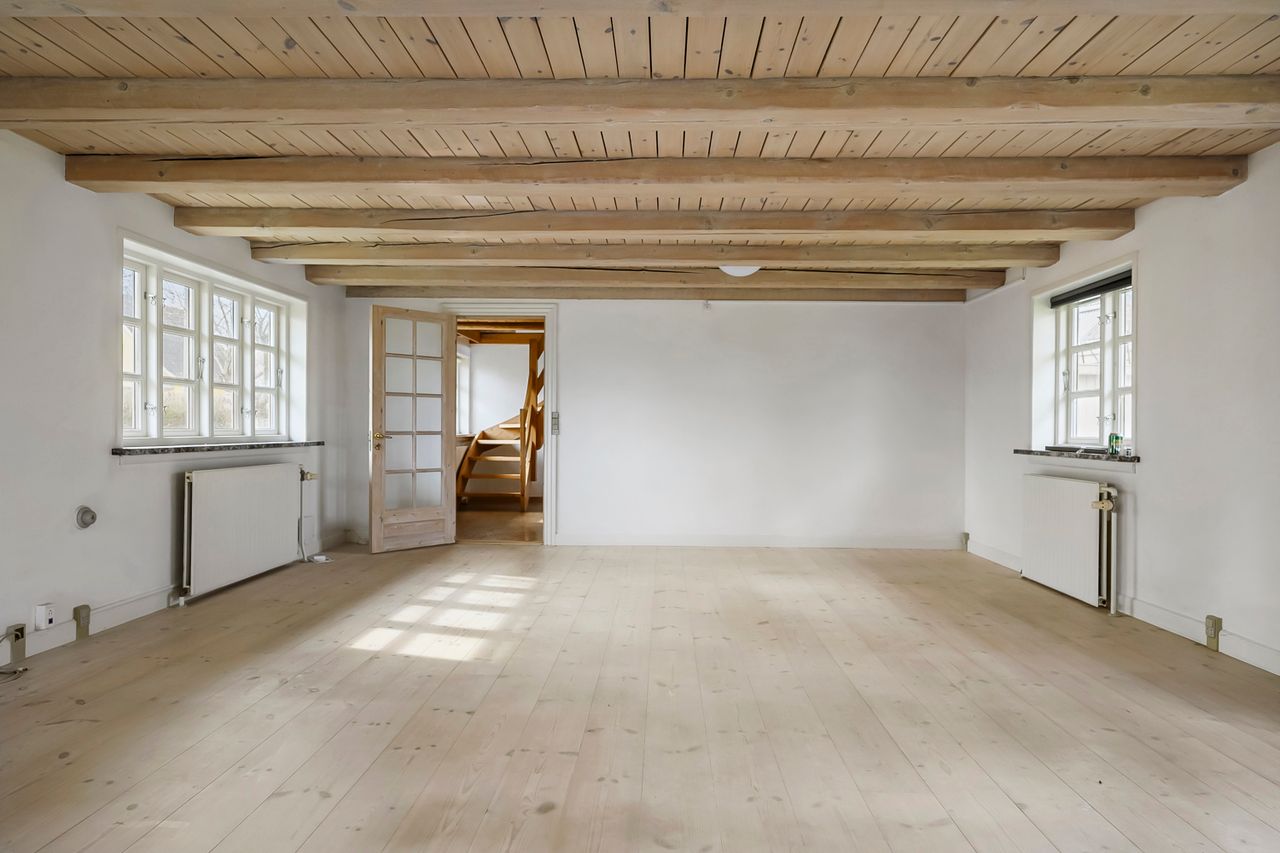 Fra køkkenet er der adgang til førstesalen, som byder på et stort og åbent repos med loft til kip, hvilket skaber en luftig og rummelig fornemmelse. Herudover rummer etagen to gode værelser med indbyggede skabe.